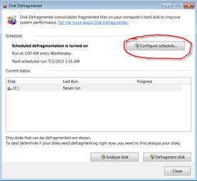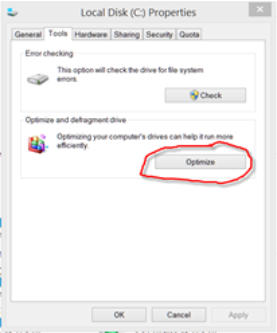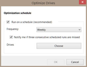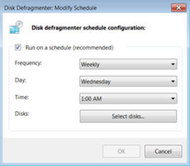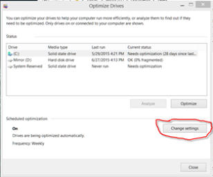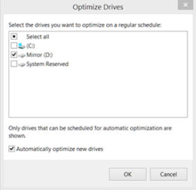 Tip for SSD UsersUnlike hard drives, solid state drive (SSD) do not need to be optimized yet Windows’ default configuration is to optimize all attached storage devices on a weekly basis. If your system uses one or more SSD(s) optimization should be turned off in order to prolong the life of these drives by reducing the number of unnecessary writes performed. Turning off optimization is simple and only takes a few seconds. Follow these instructions:1.Open File Explorer.2.Right click ‘Local Disk (C:)’ and select ‘Properties’.3.From the ‘Local Disk (C:) Properties’ window select the Tools tab and click ‘Defragment now’ on Windows 7 or ‘Optimize’ on Windows 8.4.On Win7, from the ‘Disk Defragmenter’ window select ‘Configure schedule’. On Win8, from the ‘Optimize Drives’ window select ‘Change Settings’.5.If the system has only SSD drives then uncheck ‘Run on a schedule (recommended)’, click ‘OK’, and close all windows. If the system has a combination of SSD and hard drive then click on ‘Select disks’ for Win7 or ‘Choose’ for Win8.6.From the next window, deselect the SSD(s), probably (C:), and press ‘OK’. Then close all windows.